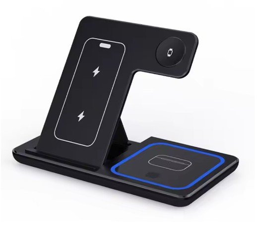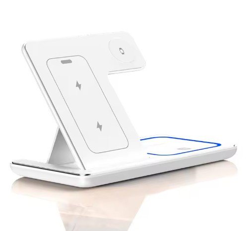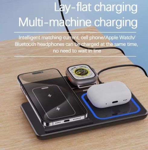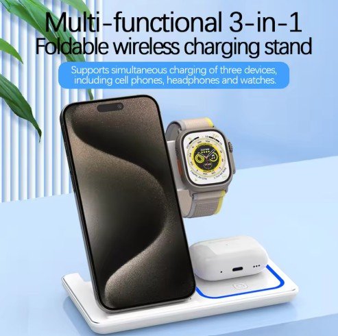 The 3-in-1 Foldable Wireless Charger Stand is designed for Apple users seeking a convenient, space-saving solution to charge their iPhone 15/14/13/12 series, Apple Watch, and AirPods (3rd/2nd Gen) simultaneously. This foldable dock combines fast wireless charging, compatibility with MagSafe, and a compact design, making it ideal for desks, nightstands, or travel.