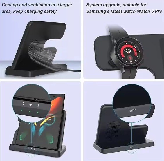 A 3-in-1 Wireless Charger Stand is designed to simultaneously charge a Samsung smartphone (e.g., S23, S22, S21), a Galaxy Watch (e.g., Watch 5, Watch 4), and Galaxy Buds (e.g., Buds 2 Pro, Buds+). Offering up to 15W fast charging for compatible devices, this dock streamlines charging for Samsung users, reducing clutter and cable management. Below is a detailed analysis of its features, compatibility, and value.
