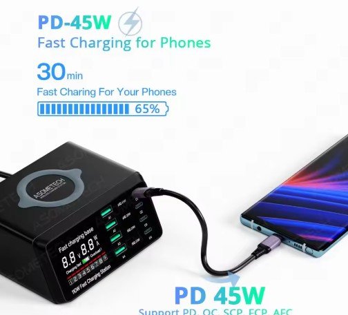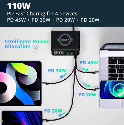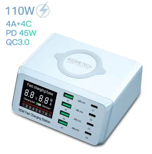 The ASOMETECH 110W USB Type-C Charger is a high-capacity power hub designed to charge multiple devices simultaneously, including smartphones, tablets, and laptops. It combines wired fast charging (USB-C PD, QC3.0) with wireless charging capabilities, making it ideal for users with diverse device ecosystems.