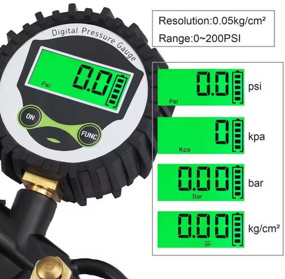 - High-Precision Pressure Gauge: Accurately measures tire pressure in PSI, BAR, or KPA (0-200 PSI range) with a clear analog or digital display (specify type) for quick, easy readings—essential for maintaining factory-recommended pressure levels.
