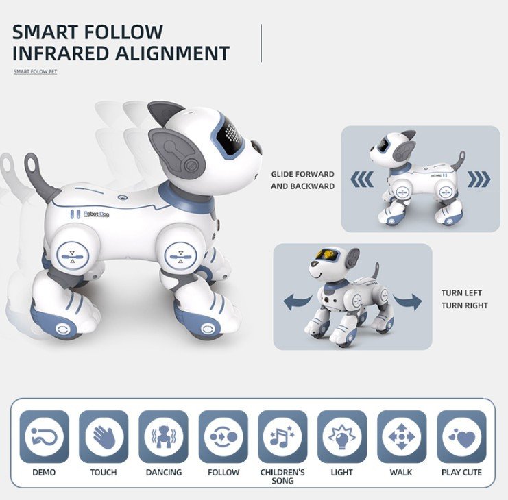 - Dual Control Modes: Operate the robot dog using a handheld remote or voice commands (e.g., "Sit," "Roll Over," "Play Music").