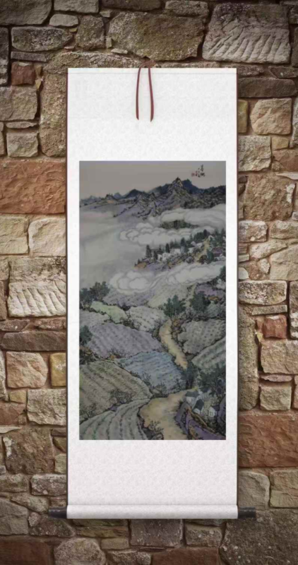 Wang Baolei’s painting ink-wash painting “Dreamland” depicts a scene in the style of traditional Chinese landscape painting. The artwork features a serene and peaceful ambiance, predominantly rendered in elegant hues of blue, green, and purple, which capture the essence of mountains and trees. There are no human figures present, but several small cottages dot the valleys, adding a touch of life to the tranquil scene.