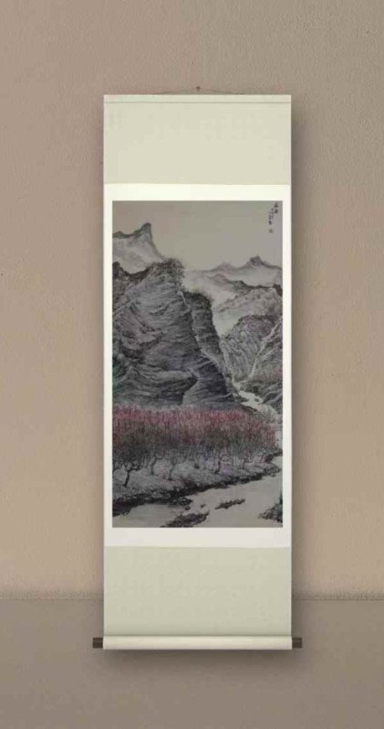 This painting “Yun Chun” (literally meaning “Implicit Spring”) by Wang Baolei showcases a breathtaking scene of nature’s tranquility and beauty. At the center stands a towering mountain peak, its summit adorned with a pristine layer of snow, contrasting sharply with the vibrant hues below. The mountain, characterized by its rugged terrain and stark gray hues, serves as a majestic backdrop.
