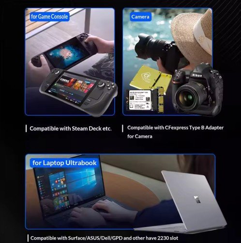 - M.2 2230 Size: Ultra-small form factor (22mm x 30mm) tailored for compact devices like the Steam Deck and Surface Pro X.