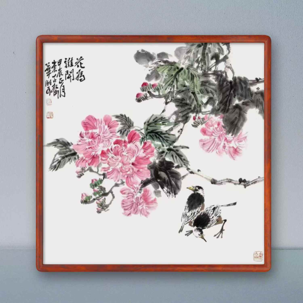 Zhao Huashuang’s painting titled “For Whom the Flowers Bloom” depicts a black-and-white bird perched gracefully on a tree branch, against a backdrop of flourishing pink peony flowers. The bird appears leisurely and at ease, seemingly engaged in admiring or searching for food. The peony flowers, dominated by shades of pink, feature layered petals interspersed with green leaves, adding a touch of vitality to the scene. The overall palette of the painting is vivid, with smooth and fluid lines, imbuing it with an aura of Eastern artistic charm.