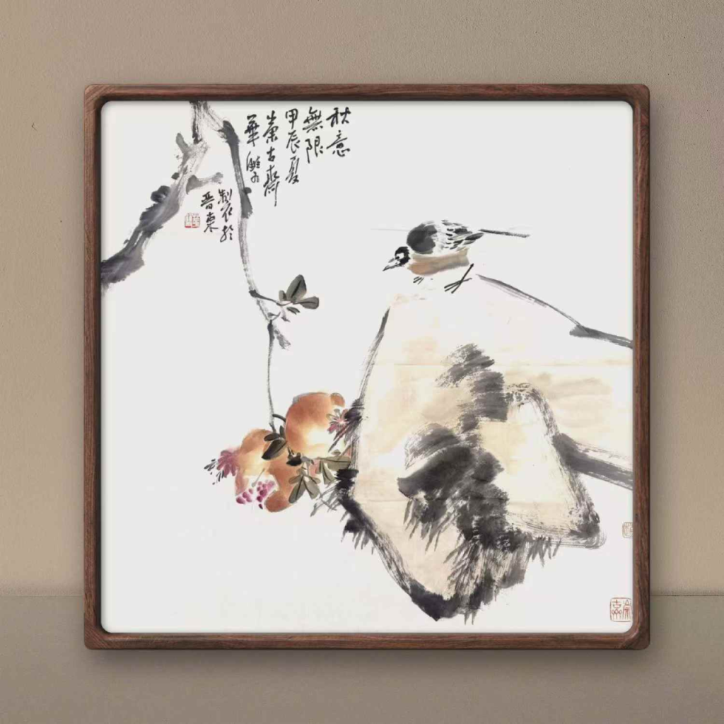 The painting titled “Boundless Autumn Feelings” by Zhao Huashuang is a masterpiece of Chinese ink painting that captures the essence of the autumn season. It features two birds and some fruits as its main subjects. On the left, a bird stands perched on a branch, while on the right, another bird soars gracefully through the air. The backdrop of the painting is a light gray sky adorned with a few fluffy white clouds, adding a serene and peaceful ambiance.