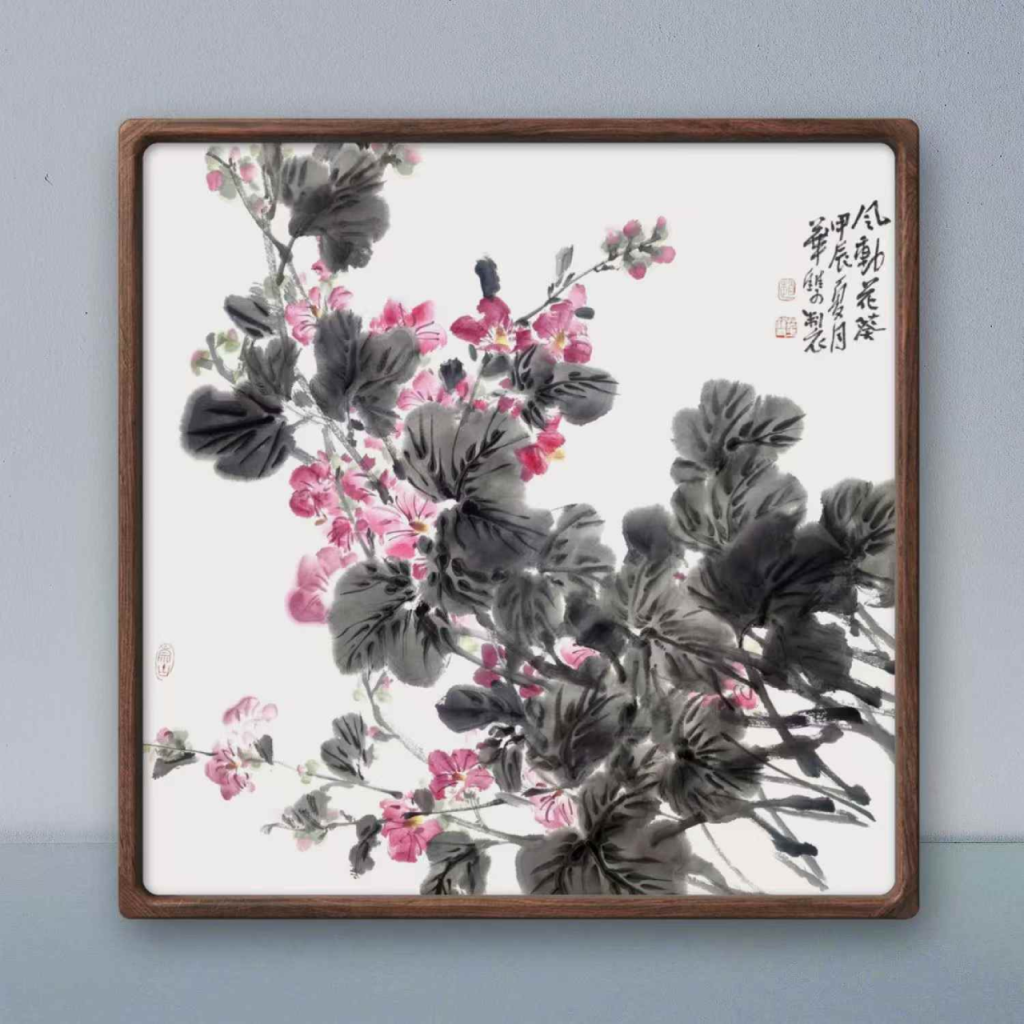 Zhao Huashuang’s painting titled “Wind-Moved Sunflower-Like Flowers” depicts a cluster of pink flowers and green leaves in the traditional Chinese ink painting style. The flowers are densely grown at the center of the painting, with petals exhibiting a delicate pink hue and the flower cores appearing more vibrant. The leaves, primarily rendered in ink, exhibit various shapes—some are oval, while others curl into wavy forms. The entire painting has a white background, giving it a clean and refreshing feel. In the top right corner of the painting, four elegant black Chinese characters flow smoothly, likely representing the painter’s name or the title of the work, harmonizing perfectly with the overall aesthetic. At the bottom left corner, a red seal, commonly used to signify the artist’s identity or to authenticate the work, adds a touch of authenticity and finality to the composition.
