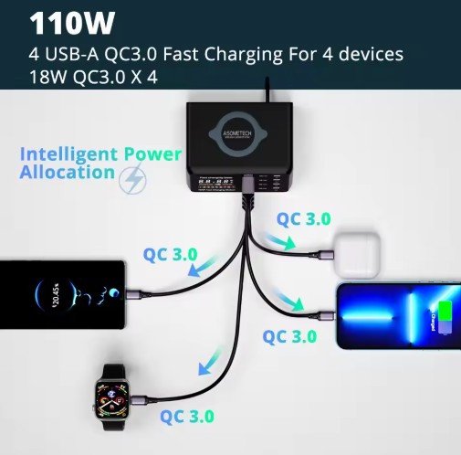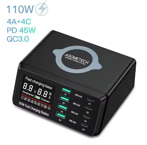 The ASOMETECH 110W USB Type-C Charger is a high-capacity power hub designed to charge multiple devices simultaneously, including smartphones, tablets, and laptops. It combines wired fast charging (USB-C PD, QC3.0) with wireless charging capabilities, making it ideal for users with diverse device ecosystems.