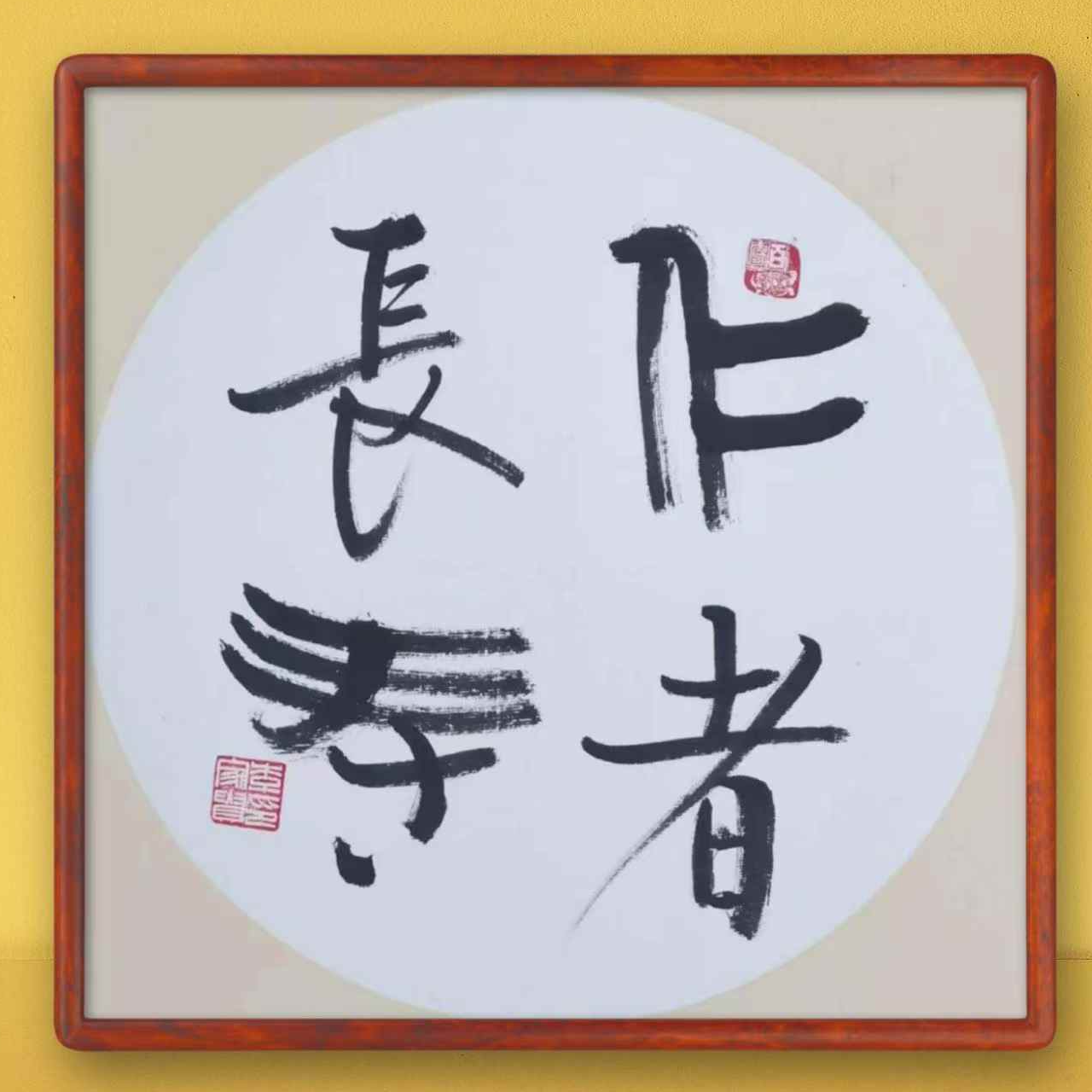 This artwork, presumably a calligraphy piece by Li Jiagui, elegantly captures the timeless Chinese phrase “The benevolent ones enjoy longevity” (仁者长寿) on a circular white backdrop.