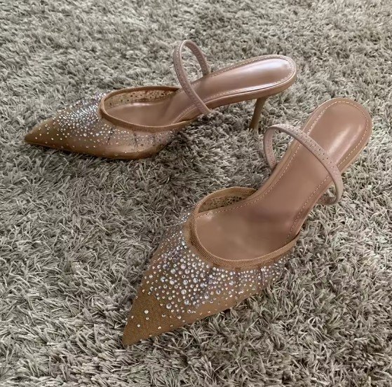 Shine bright this summer with these stunning women’s sandals, designed to elevate any occasion. Featuring dazzling rhinestone accents on a breathable mesh upper, these high heels combine glamour with comfort. The sleek pointed-toe and slingback design offer a chic, sophisticated silhouette, perfect for parties, weddings, or evenings out. The adjustable buckle ensures a secure fit, while the lightweight construction and cushioned footbed keep you comfortable all night long. Step into elegance with these eye-catching pumps—where luxury meets effortless style.
