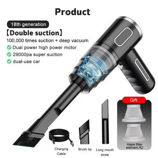 The Wireless 29,000PA Car Vacuum Cleaner is a high-powered, cordless cleaning tool designed for automotive and household use. With its strong suction, wet/dry capabilities, and portable design, it offers a versatile solution for tackling dirt, debris, and spills in cars, homes, and other tight spaces.