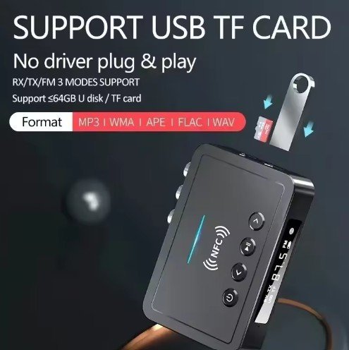 - Transmitter Mode: Sends audio from wired sources (TV, MP3 player) to Bluetooth headphones/speakers.