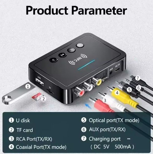 - Receiver Mode: Connects to Bluetooth devices (phones, tablets) to play audio through wired speakers/headphones.