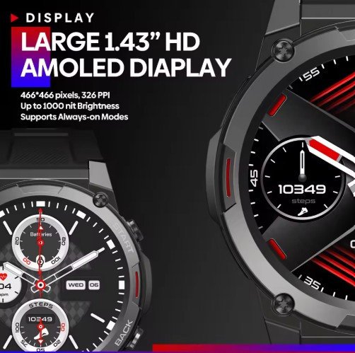 - 1.43-inch AMOLED Screen: Offers vibrant colors, deep blacks, and sharp visuals for notifications, fitness stats, and app interfaces.